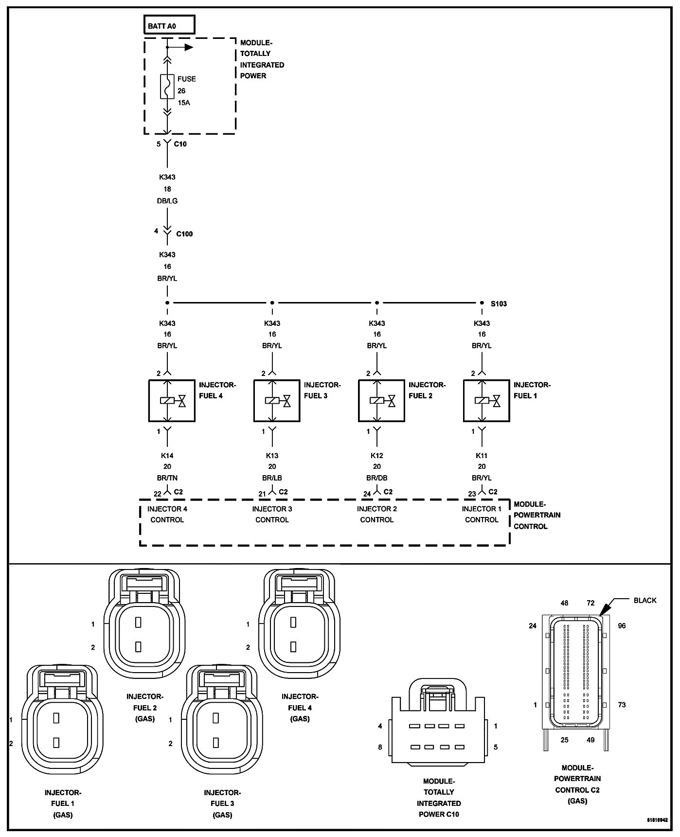 Using a 12 volt test light connected to ground, check the (K343) Fused Main Relay Output circuit in the Fuel Injector 1 harness connector.