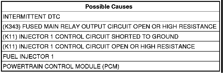 - Repair the (K11) Injector 1 Control circuit for an open circuit or high resistance.