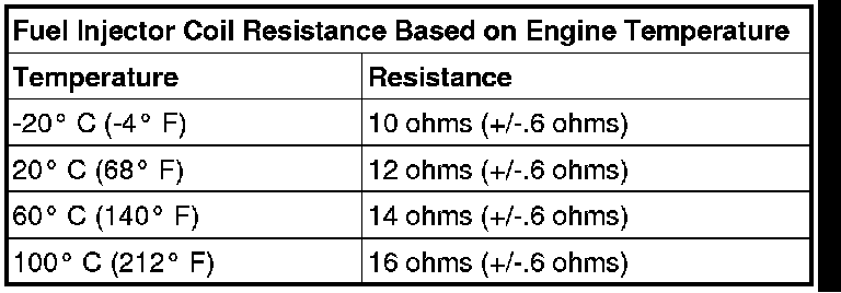 NOTE: The resistance of the circuit will vary according to the temperature of the injector coil. Use the table below to determine the resistance range of the injector.