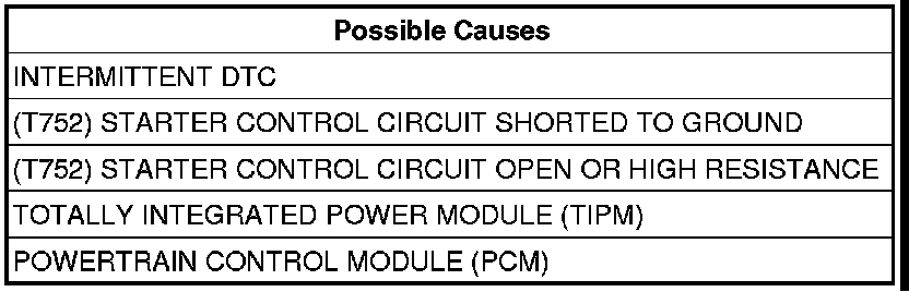 - Repair the (T752) Starter Control circuit for an open circuit or high resistance.