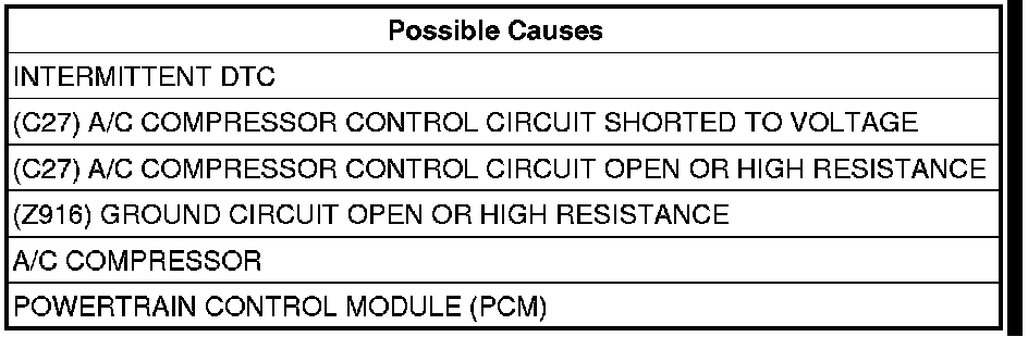 - Repair the (C27) A/C Compressor Control circuit for a short to voltage.