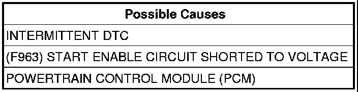 The PCM detects voltage on the (F963) Start Enable circuit for a specified time after the engine is running.