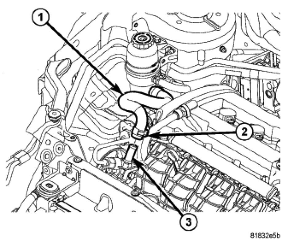 1. Slide hose clamps (2) onto both ends of the power steering fluid supply hose (1) far enough to clear the fittings on the reservoir and pump once the hose is installed.