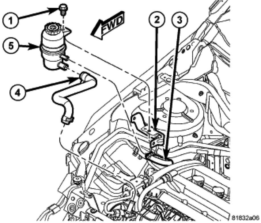 3. Expand the hose clamp (4) at the fluid reservoir (5) and slide it over the hose and fitting. Secure the clamp once it is past the bead formed into the fluid reservoir fitting.