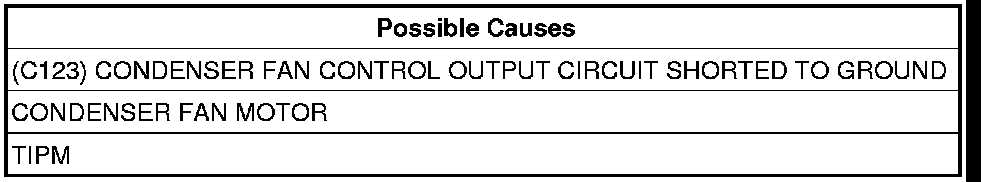 - Repair the (C123) Condenser Fan Control Output circuit for a short to ground.