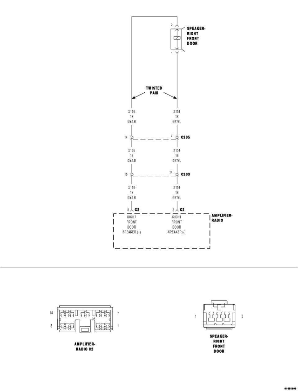 - Repair the (X154) Amplified Right Front Door Speaker (-) circuit for an open.