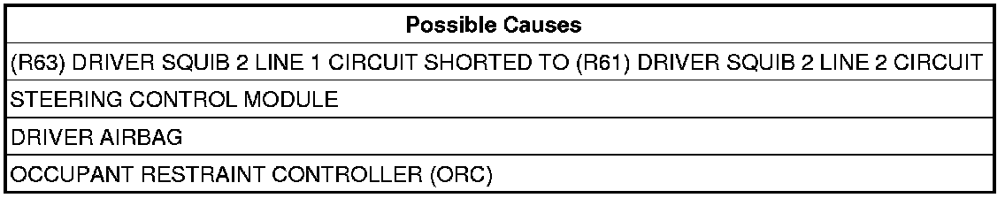 - Repair the (R63) Driver Squib 2 Line 1 circuit for a short to the (R61) Driver Squib 2 Line 2 circuit.