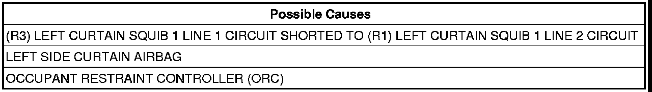 - Repair the (R3) Left Curtain Squib 1 Line 1 circuit for a short to the (R1) Left Curtain Squib 1 Line 2 circuit.