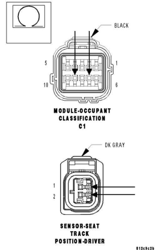 Measure the resistance of the (R261) Seat Position Sensor Data-Driver circuit between the OCM C1 connector and the Driver Seat Track Position Sensor connector.