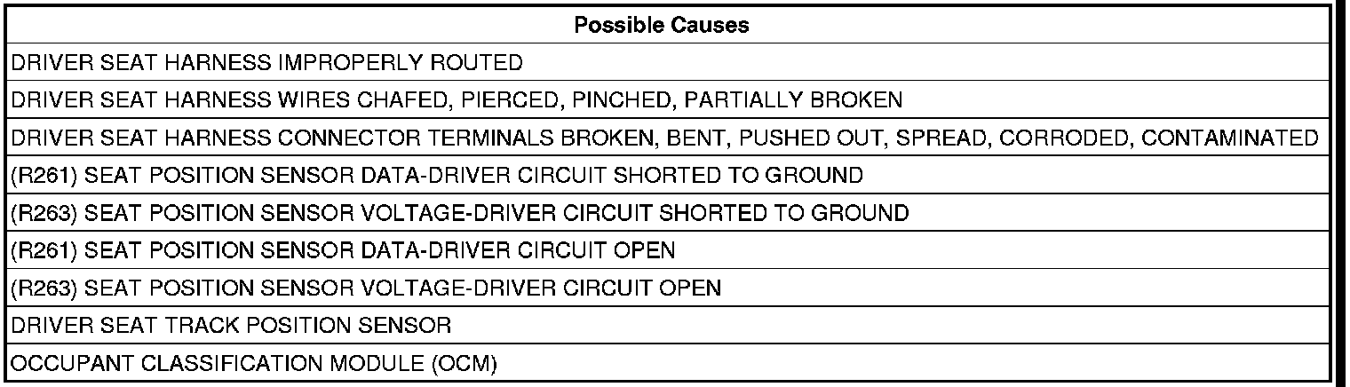 Measure the resistance of the (R263) Seat Position Sensor Voltage-Driver circuit between the OCM C1 connector and the Driver Seat Track Position Sensor connector.