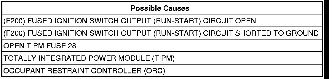 - Repair the open (F200) Fused Ignition Switch Output (Run-Start) circuit.
