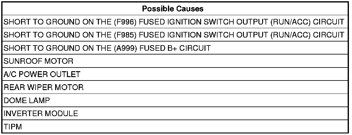 - Repair the (F996) Fused Ignition Switch Output (Run-Acc) circuit for a short to ground.