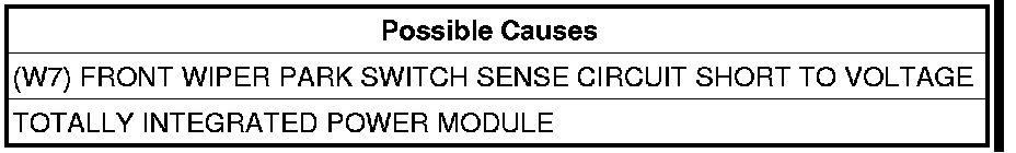 - Repair the (W7) Front Wiper Park Switch Sense circuit for a short to voltage.