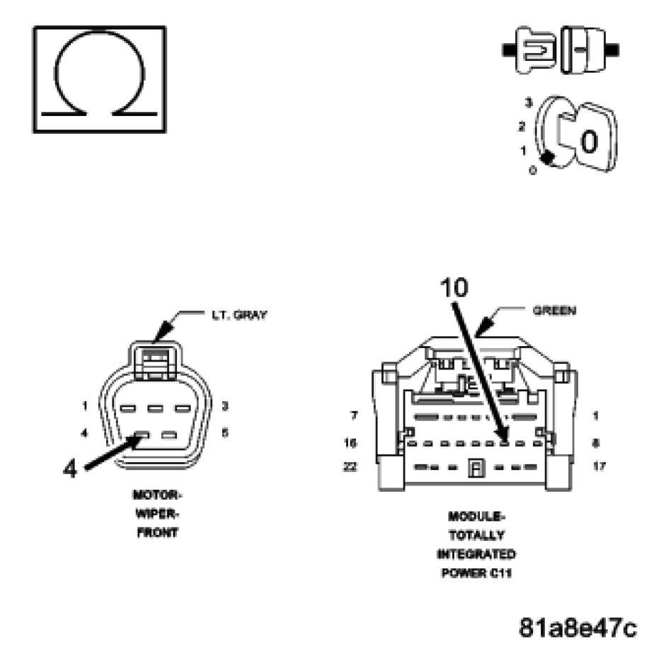 Using a 12-volt test light connected to ground, check the Fused Accessory Relay Output circuit in the Front Wiper Motor harness connector.