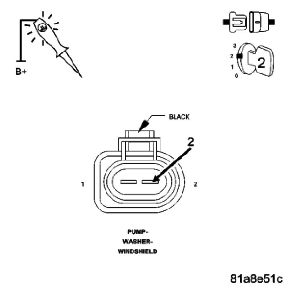 Using a 12-volt test light connected to ground, check the Fused Accessory Relay Output circuit in the Front Washer Pump Motor harness connector.