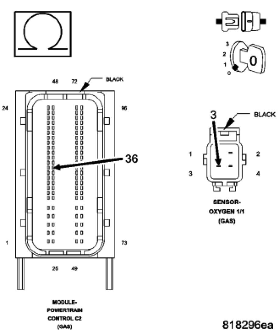 Using the wiring diagram/schematic as a guide, inspect the wiring and connectors between the Oxygen Sensor 1/1 and the Powertrain Control Module (PCM).