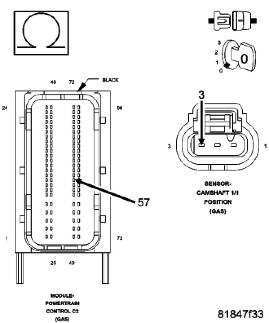 Measure the resistance of the (K900) Sensor Ground circuit between the Camshaft 1/1 Position Sensor harness connector and the Powertrain Control Module (PCM) harness connector.