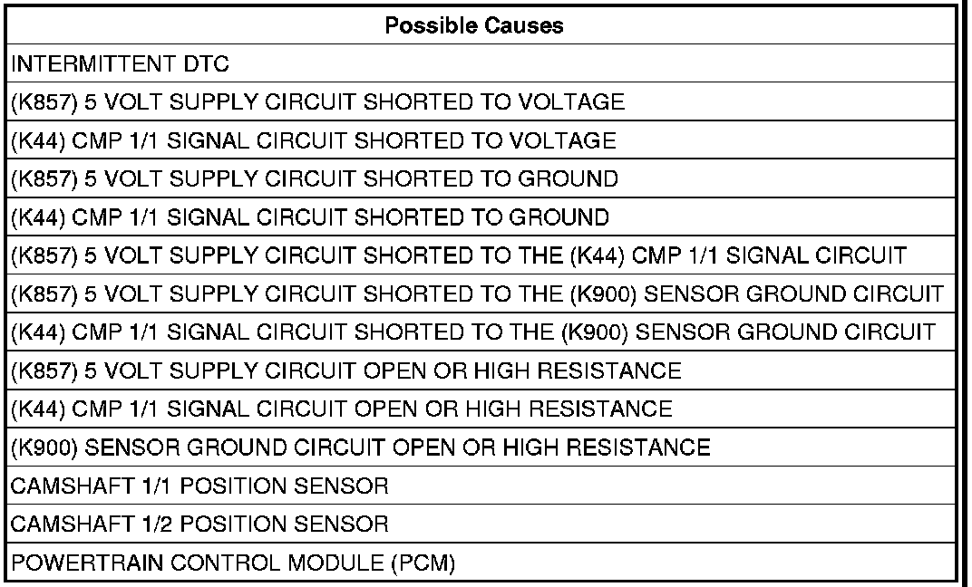 The PCM receives either no signal or an incorrect signal from the Camshaft 1/1 Position Sensor.