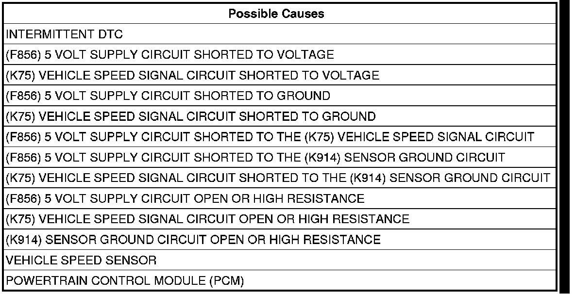 - Repair the (F856) 5 Volt Supply circuit for a short to the (K75) Vehicle Speed Signal circuit.