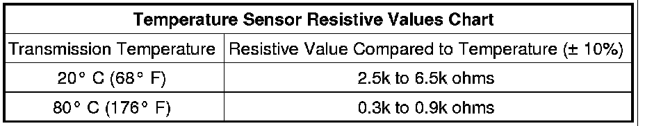 The Transmission Temperature Sensor is a thermistor that changes resistive value when subject to different temperatures. When the monitored voltage rises, the calculated temperature decreases.