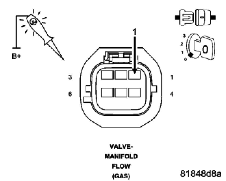 Using a 12 volt test light connected to 12 volts, check the (Z916) Ground circuit in the Manifold Flow Valve harness connector.