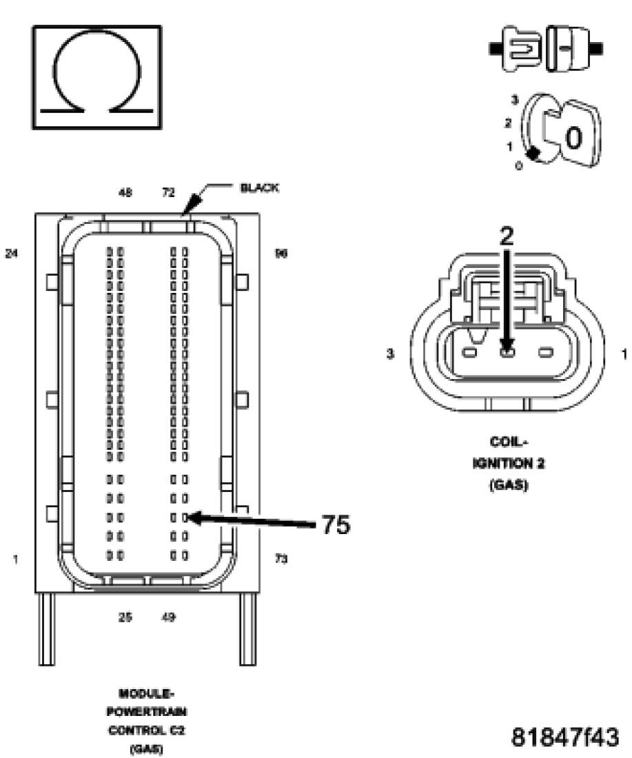Measure the resistance of the (K17) Coil 2 Control circuit between the Ignition Coil 2 harness connector and the Powertrain Control Module (PCM) harness connector.