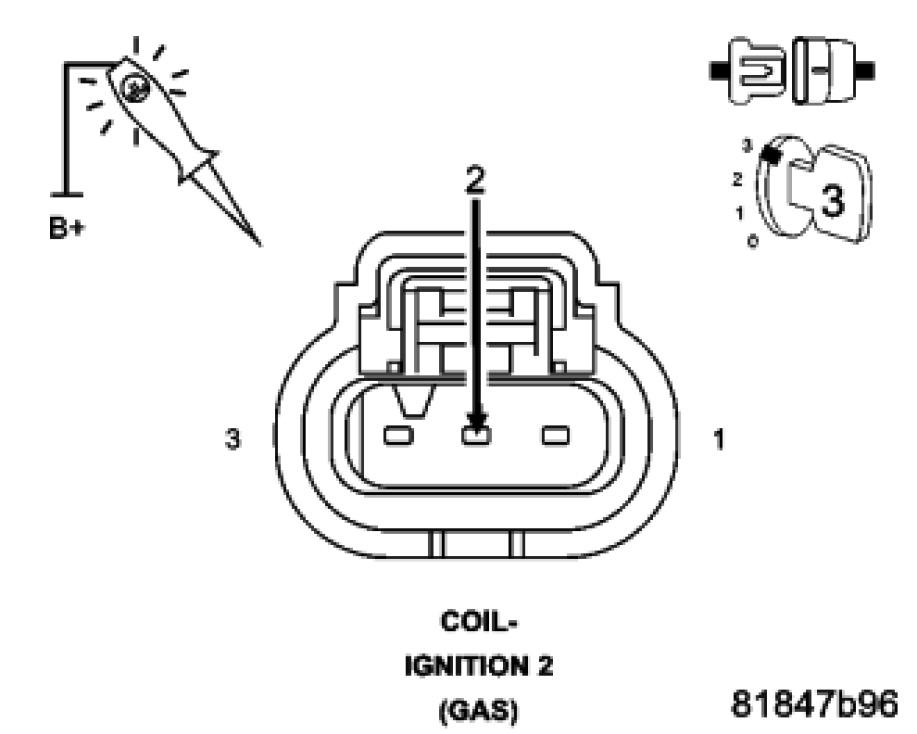 Using a 12 volt test light connected to 12 volts, check the (K17) Coil 2 Control circuit in the Ignition Coil 2 harness connector.