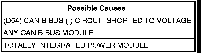 - Repair the (D54) CAN B Bus (-) circuit for a short to voltage.
