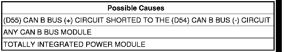 The TIPM detects the (D55) CAN B Bus (+) circuit is shorted to the (D54) CAN B Bus (-) circuit.