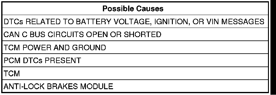 If the Anti-Lock Brakes Module fails to receive bus messages from the TCM for approximately 500 ms.