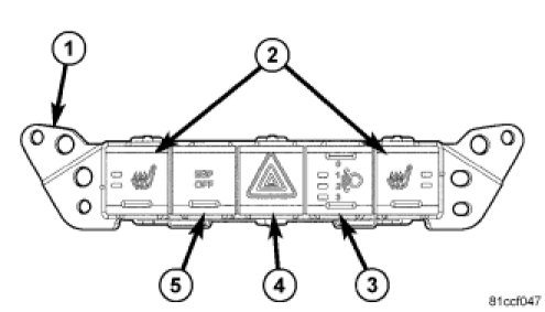 The instrument panel switch pod (1) is located just below the heater and air conditioner controls in the center stack area of the instrument panel. This switch is available in multiple configurations, which varies from two single push button switches to as many as five push button switches depending upon the optional equipment in the vehicle. The pod may include the following switches: