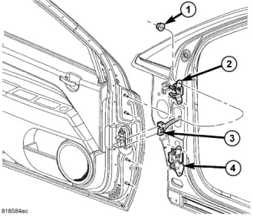 2. Loosen the upper (2) and lower (4) hinge to hinge pillar fasteners. Front Door Hinge - Removal