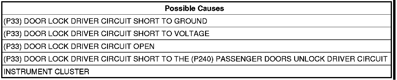 - Repair the (P33) Door Lock Driver for a short to the (P240) Passenger Doors Unlock Driver circuit.