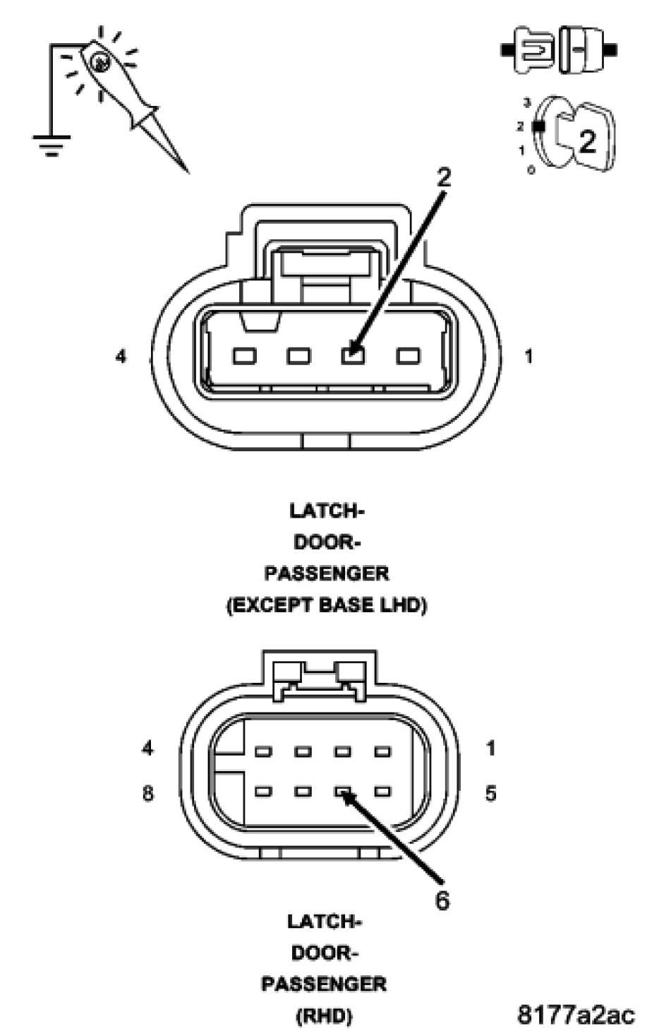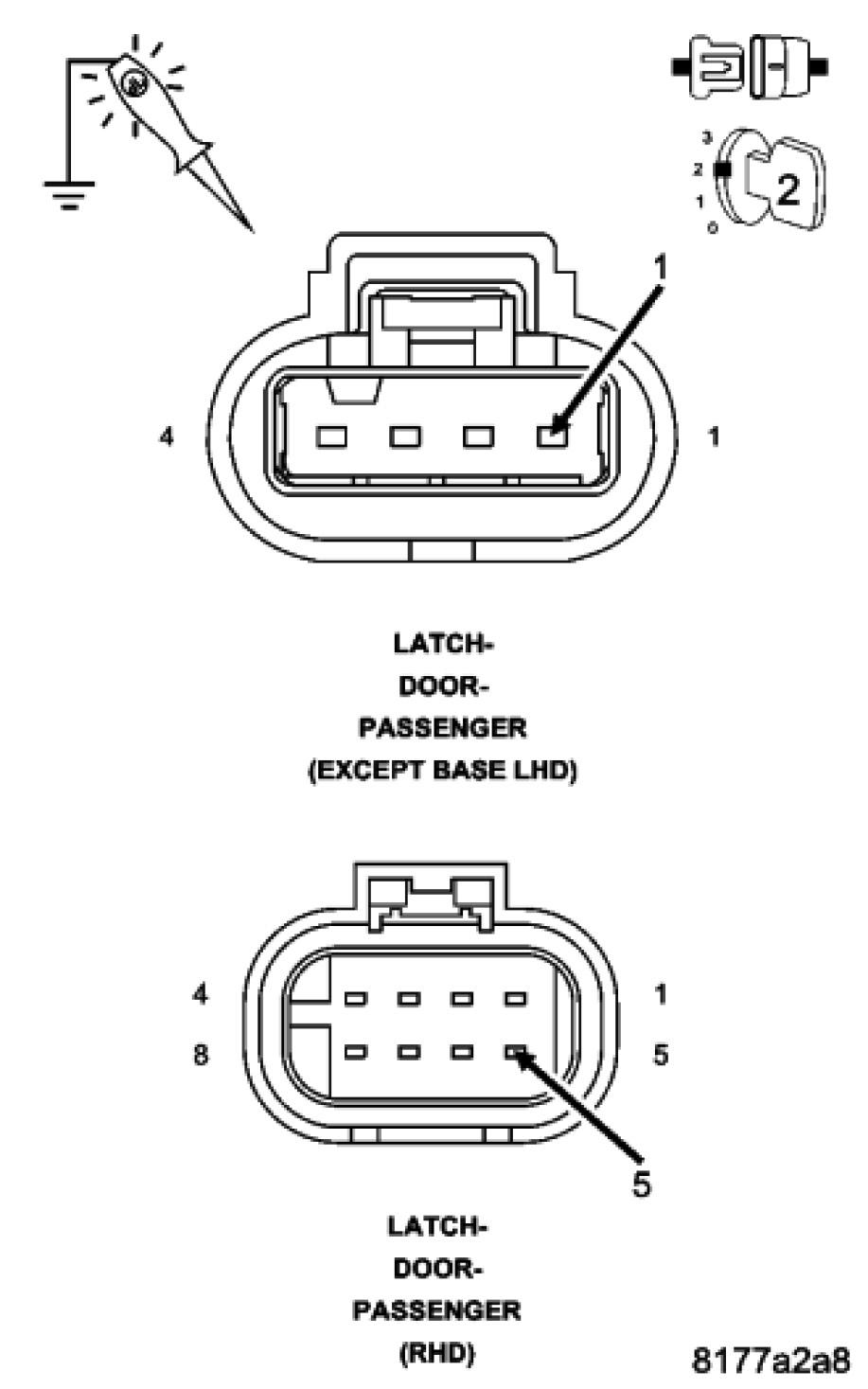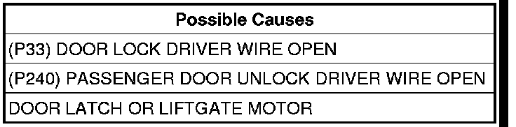 Connect a 12-volt test light between the (P33) Door Lock Driver and the (P240) Passenger Door Unlock Driver circuits in the latch connector.