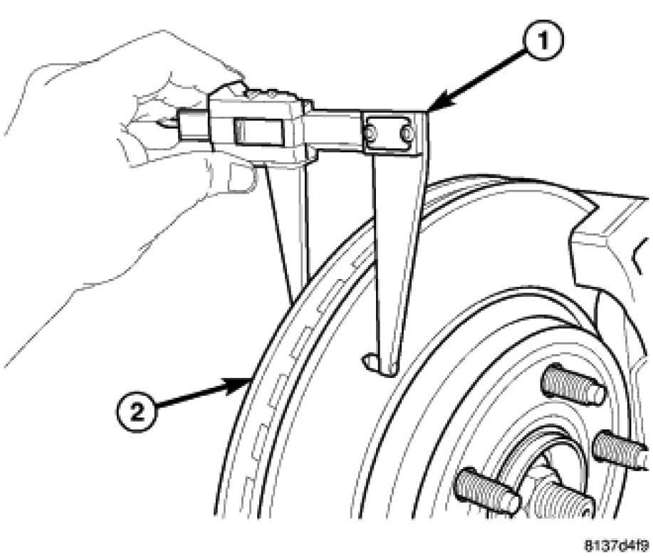 Rotor thickness variation measurements should be made in conjunction with measuring runout. Measure thickness of the brake rotor (2) at 12 equal points around the rotor braking surface with a micrometer (1) at a radius approximately 25 mm (1 inch) from edge of rotor. If thickness measurements vary beyond the specification listed in the specification table Specifications, the rotor should be refaced or replaced. Procedures.