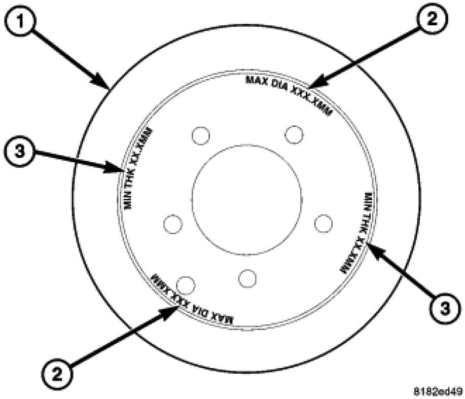 On front rotors, Minimum thickness specifications (2) are cast on the rotor's unmachined surface on the inside of the rotor (1). Limits can also be found in this component's specification table. Specifications