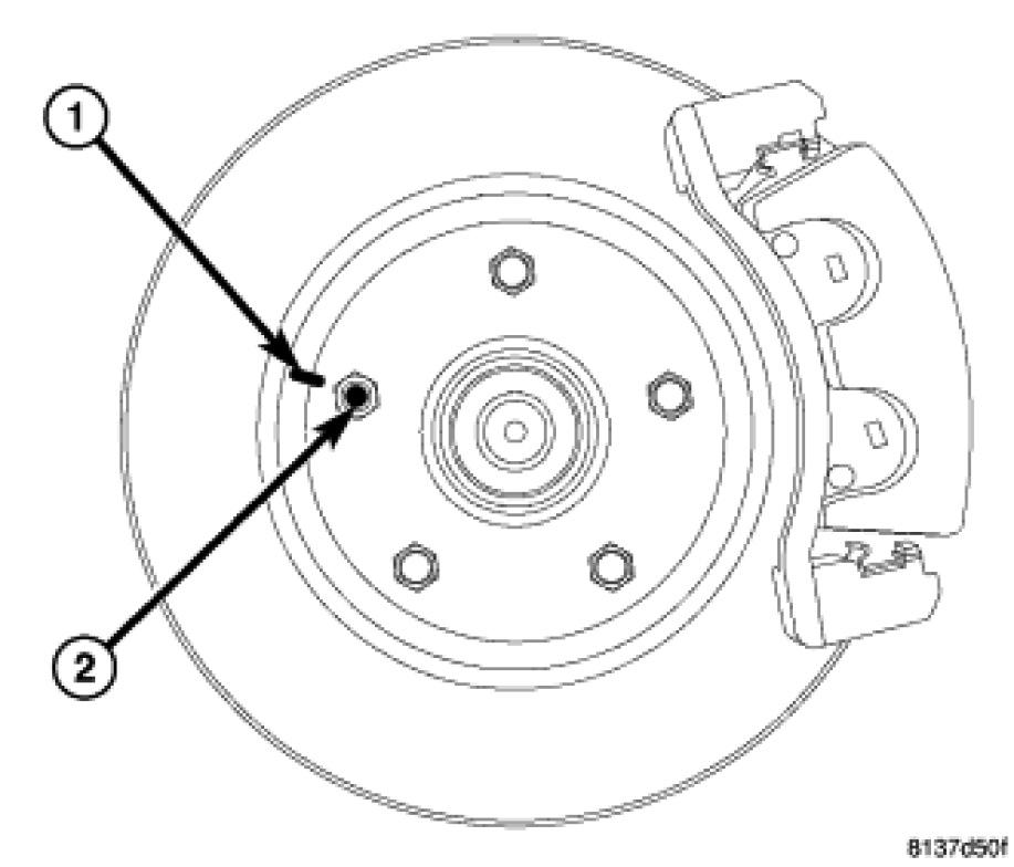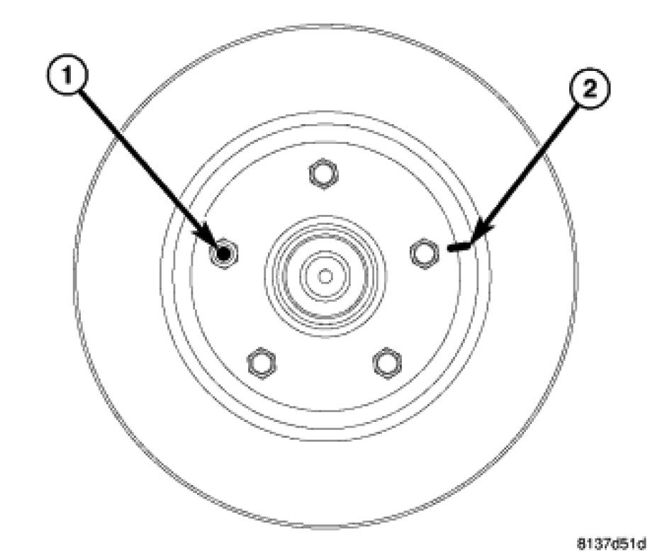 12. If hub runout does not exceed this specification, install the original rotor back on the hub, aligning the chalk mark on the rotor (2) with a wheel mounting stud, two studs apart from the original stud (1).