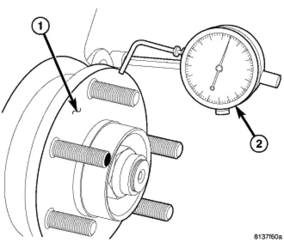 14. Mount the Dial Indicator (1), Special Tool C-3339A, and remeasure runout on both sides of the brake rotor as explained in earlier steps to see if runout is now within specifications. Specifications
