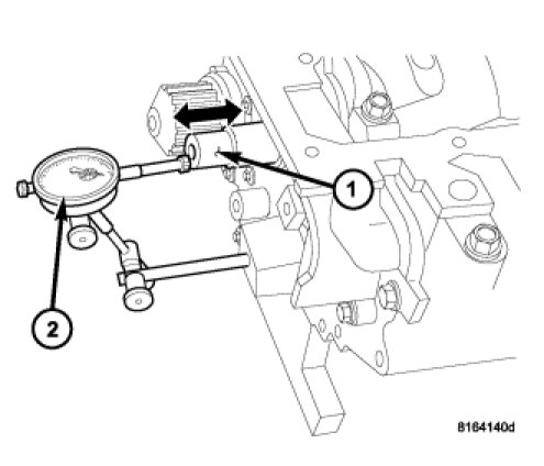 1. Mount a dial indicator (2) to front of engine with the locating probe on nose of crankshaft (1).