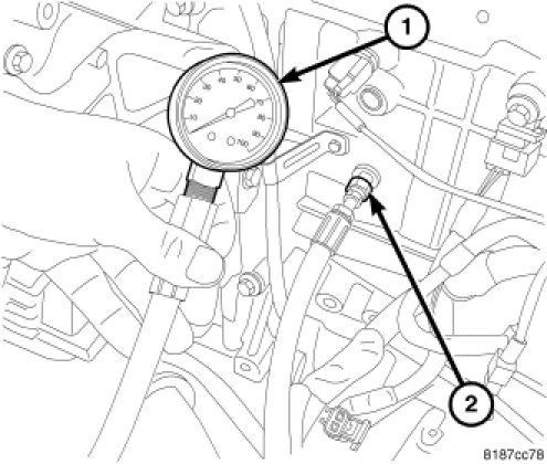 9. After test is complete, remove test gauge (1) and fitting (2).