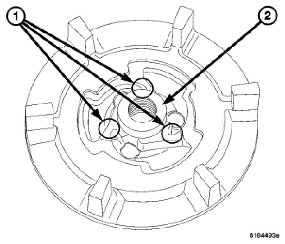 The three bridges (1) located on compressor drive hub (2) are designed to break away in the event of compressor seizure. This action prevents damage to the serpentine accessory drive belt Inspection.