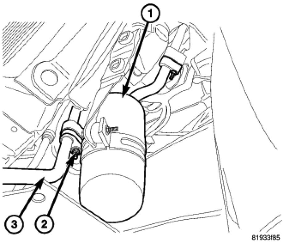 5. Reach up through the opening in the bottom of the front fascia located in the right front corner of the vehicle and remove the nut (3) that secures the A/C liquid line (1) to the A/C condenser (2).