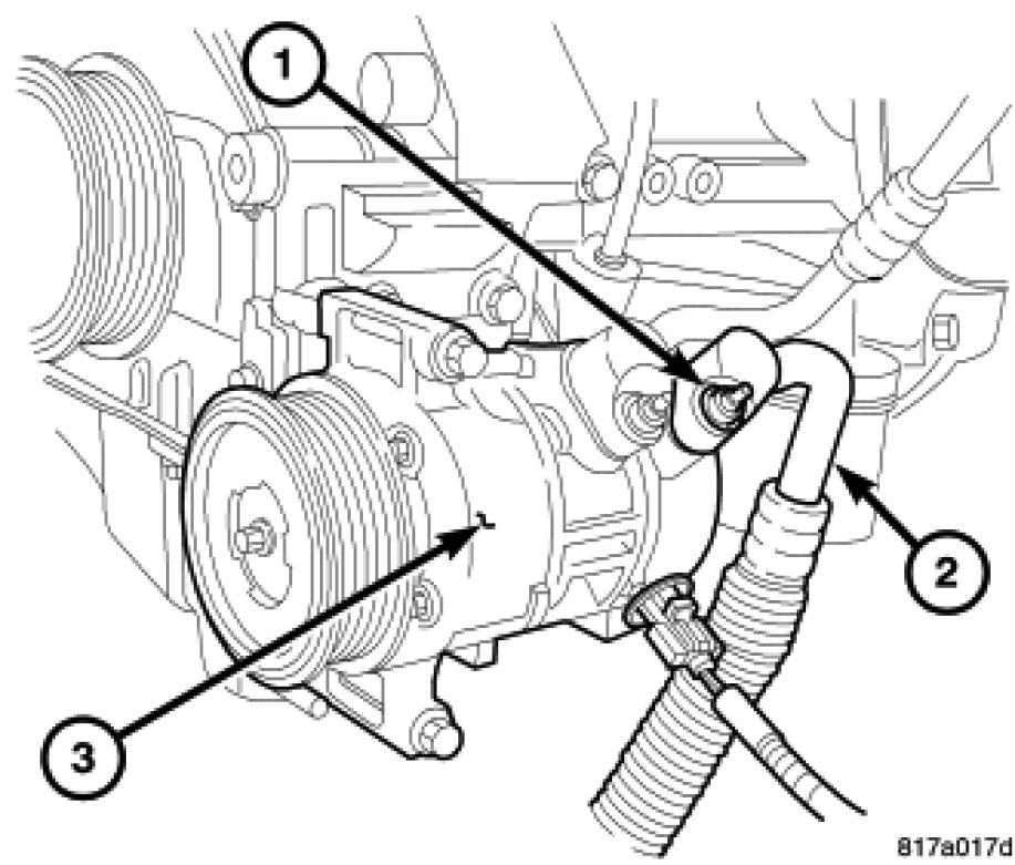 25. Remove the nut (1) that secures the lower A/C suction line (2) to the A/C compressor (3).