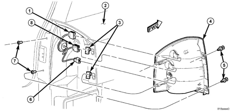 7. Install the two push pin fasteners (6) that secure the rear lamp unit to the side trough of the liftgate opening.
