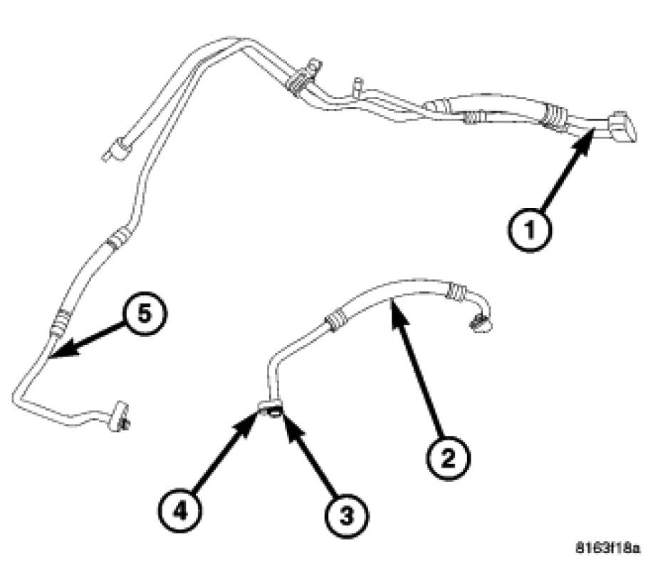 The A/C suction line is serviced in two sections. The upper section of the A/C suction line (1) is the refrigerant line that carries refrigerant from the A/C evaporator to the A/C accumulator. The lower section of the A/C suction line (2) carries refrigerant from the A/C accumulator to the A/C compressor. The upper portion of the A/C suction line is only serviced as an assembly with the A/C liquid line (5).