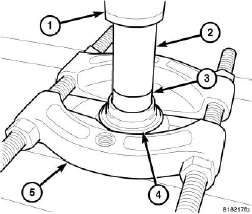 11. If the bearing race is still pressed onto the hub, install the Bearing Splitter (5), Special Tool 1130, between the hub flange and the bearing inner race (4).