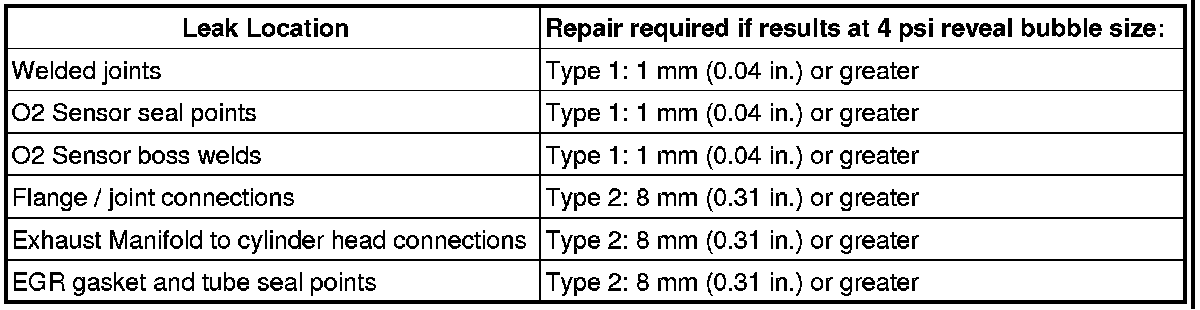 Any Type 1 or greater leaks found in welded joints, O2 sensor seal points or O2 sensor boss welds must be repaired or the component must be replaced.