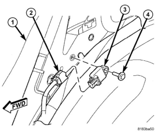 3. Install and tighten the screw (4) that secures the sensor to the inner C-pillar. Tighten the screw to 8 Nm (70 in. lbs.).