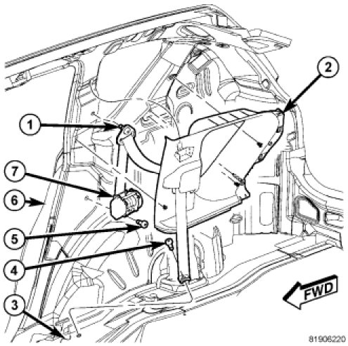 1. Position the second row seat belt and retractor (7) to the lower inner C-pillar (6).