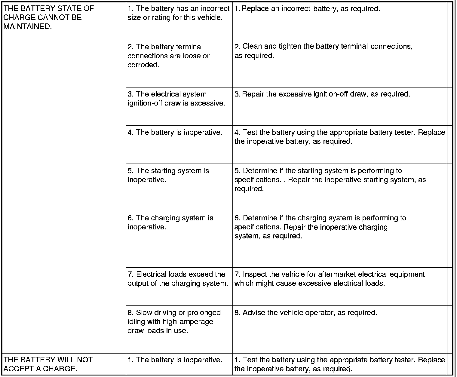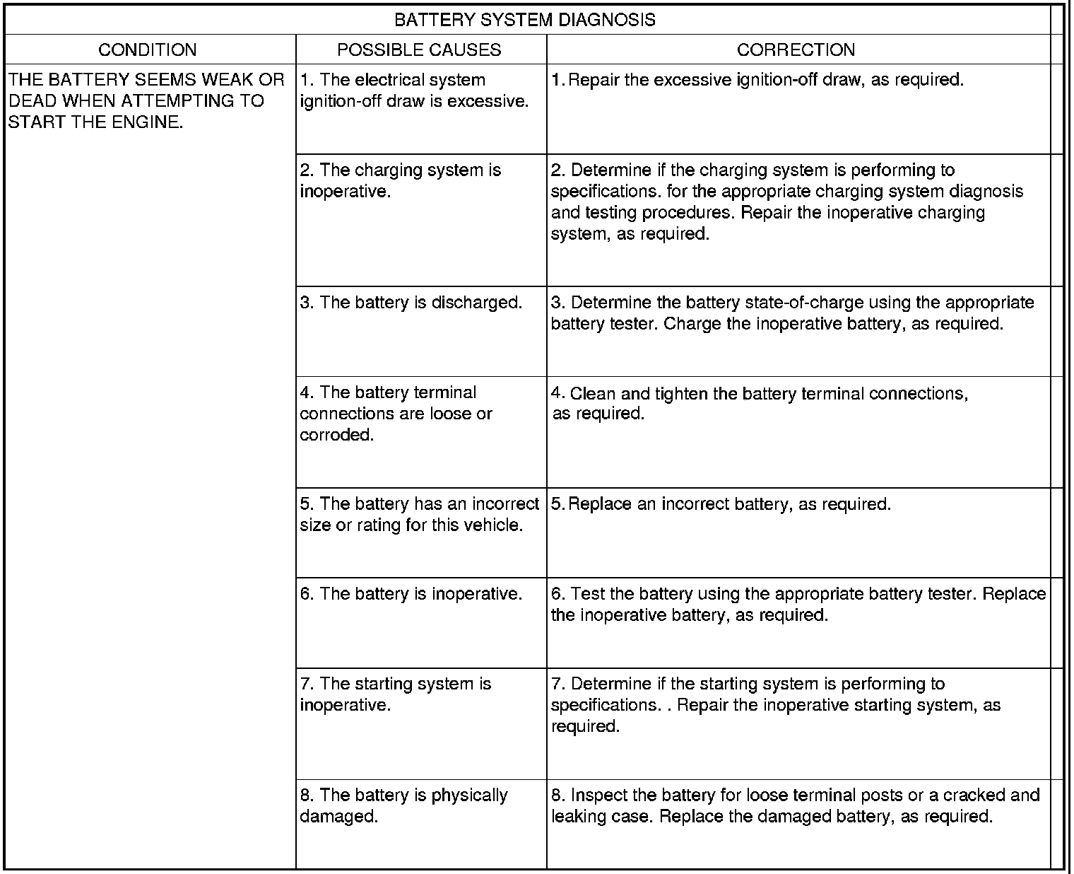 The battery, starting, and charging systems in the vehicle operate with one another and must be tested as a complete system. In order for the engine to start and the battery to maintain its charge properly, all of the components that are used in these systems must perform within specifications. It is important that the battery, starting, and charging systems be thoroughly tested and inspected any time a battery needs to be charged or replaced. The cause of abnormal battery discharge, overcharging or early battery failure must be diagnosed and corrected before a battery is replaced and before a vehicle is returned to service. The service information for these systems has been separated within this service manual to make it easier to locate the specific information you are seeking. However, when attempting to diagnose any of these systems, it is important that you keep their interdependency in mind.